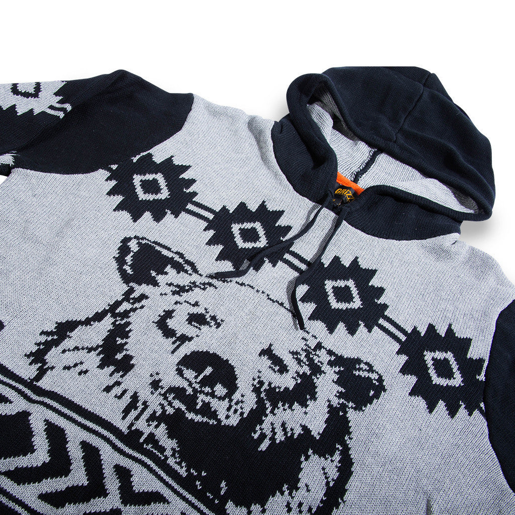 Mid weight cotton sweater with Jacquard knit artwork, pull over hood with ribbed hem and cuffs, self fabric draw cord.